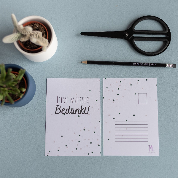 Hoe bedank je een meester die echt het verschil maakte? Met deze ansichtkaart met de tekst ‘Lieve meester bedankt’ geef je een persoonlijk en krachtig gebaar. Het stoere ontwerp en de duidelijke boodschap maken dit kaartje ideaal om jouw dankbaarheid te tonen.