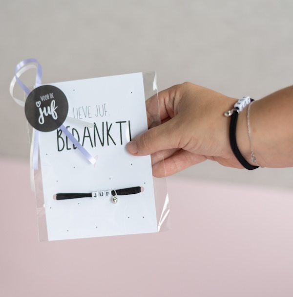 Wil je de juf laten weten hoe dankbaar je bent? Met dit juf armbandje op een zwart bandje geef je een stijlvol en persoonlijk cadeau. Simpel, mooi en altijd passend – of het nu voor juffendag, het einde van het schooljaar of kerst is.