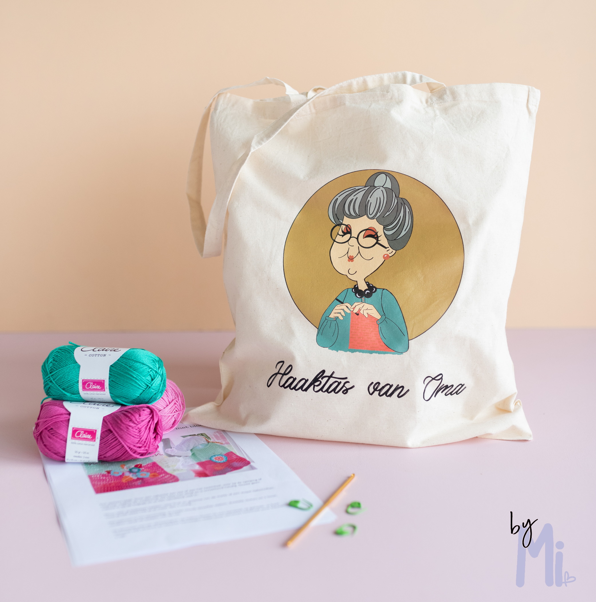 Wil je oma verrassen met iets origineels én bruikbaars? Deze haaktas voor oma is een liefdevol samengesteld cadeau waarmee ze direct creatief aan de slag kan. Alles wat ze nodig heeft voor een middag ontspannen haken zit in deze ruime katoenen tas met gezellige oma-illustratie.