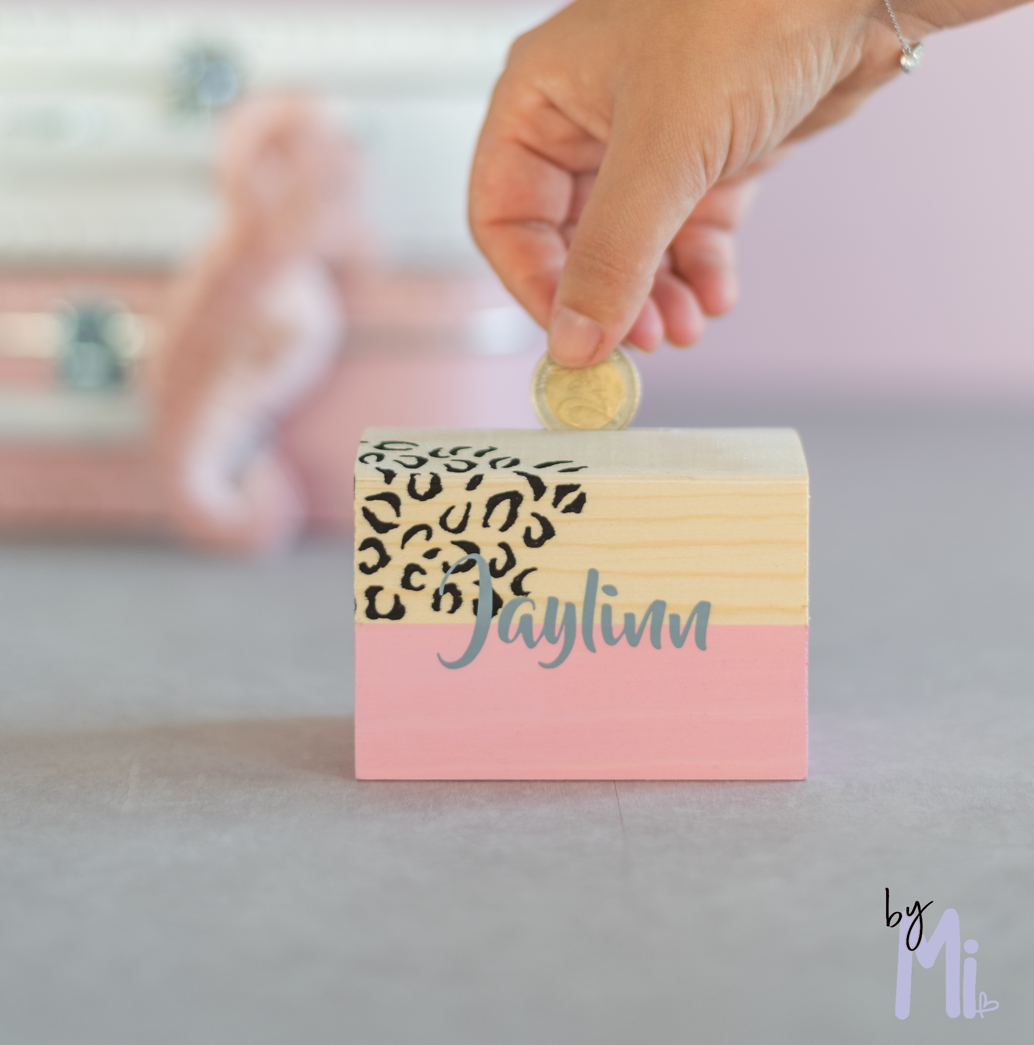 Op zoek naar een cadeau dat stijlvol, persoonlijk én praktisch is? Deze houten spaarpot met naam is een echte eyecatcher op de kinderkamer. Met een vrolijke luipaardprint in zachte roze tinten en de naam Jaylinn in sierlijke letters, maak je sparen niet alleen leuk maar ook bijzonder.
