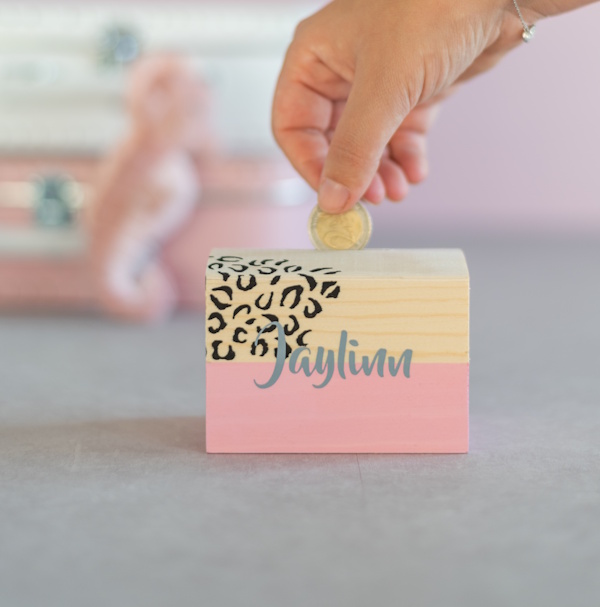 Op zoek naar een cadeau dat stijlvol, persoonlijk én praktisch is? Deze houten spaarpot met naam is een echte eyecatcher op de kinderkamer. Met een vrolijke luipaardprint in zachte roze tinten en de naam Jaylinn in sierlijke letters, maak je sparen niet alleen leuk maar ook bijzonder.