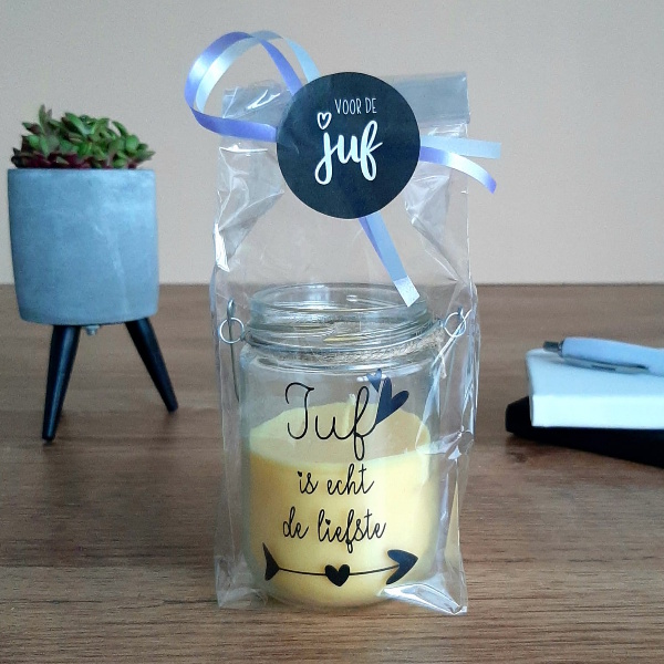 Wat geef je een juf die het hele jaar heeft gestraald? Dit gele glazen kaarsje met de tekst ‘Juf is echt de liefste’ is een klein maar veelzeggend bedankje. Het sfeervolle kaarslicht en de warme boodschap maken dit cadeautje perfect voor een juf die je wilt laten weten hoe bijzonder ze is.