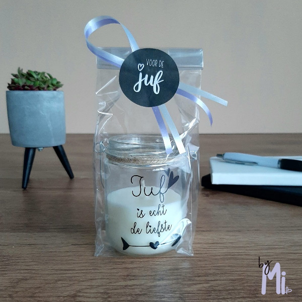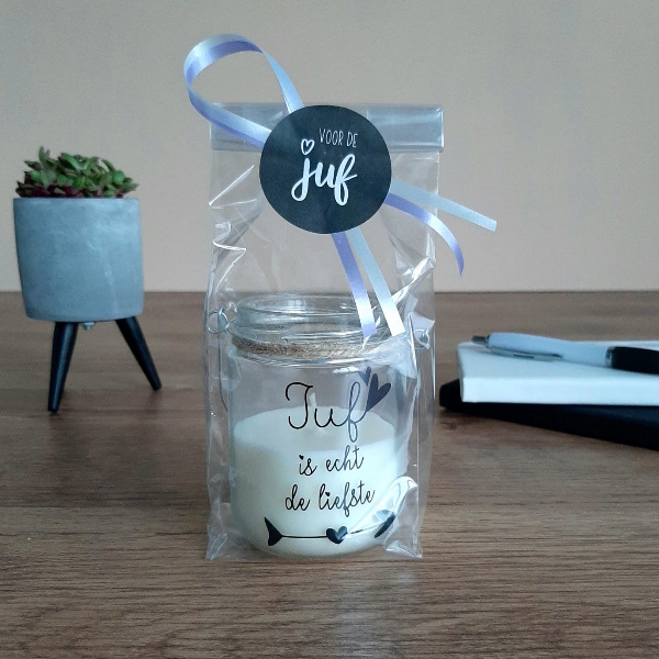 Het kaarsje wordt netjes verpakt met een lintje en label. Je hoeft niets meer in te pakken, het is direct klaar om te geven. Een klein lichtje dat groot spreekt – ideaal als dankjewel aan het einde van het schooljaar of gewoon tussendoor.
