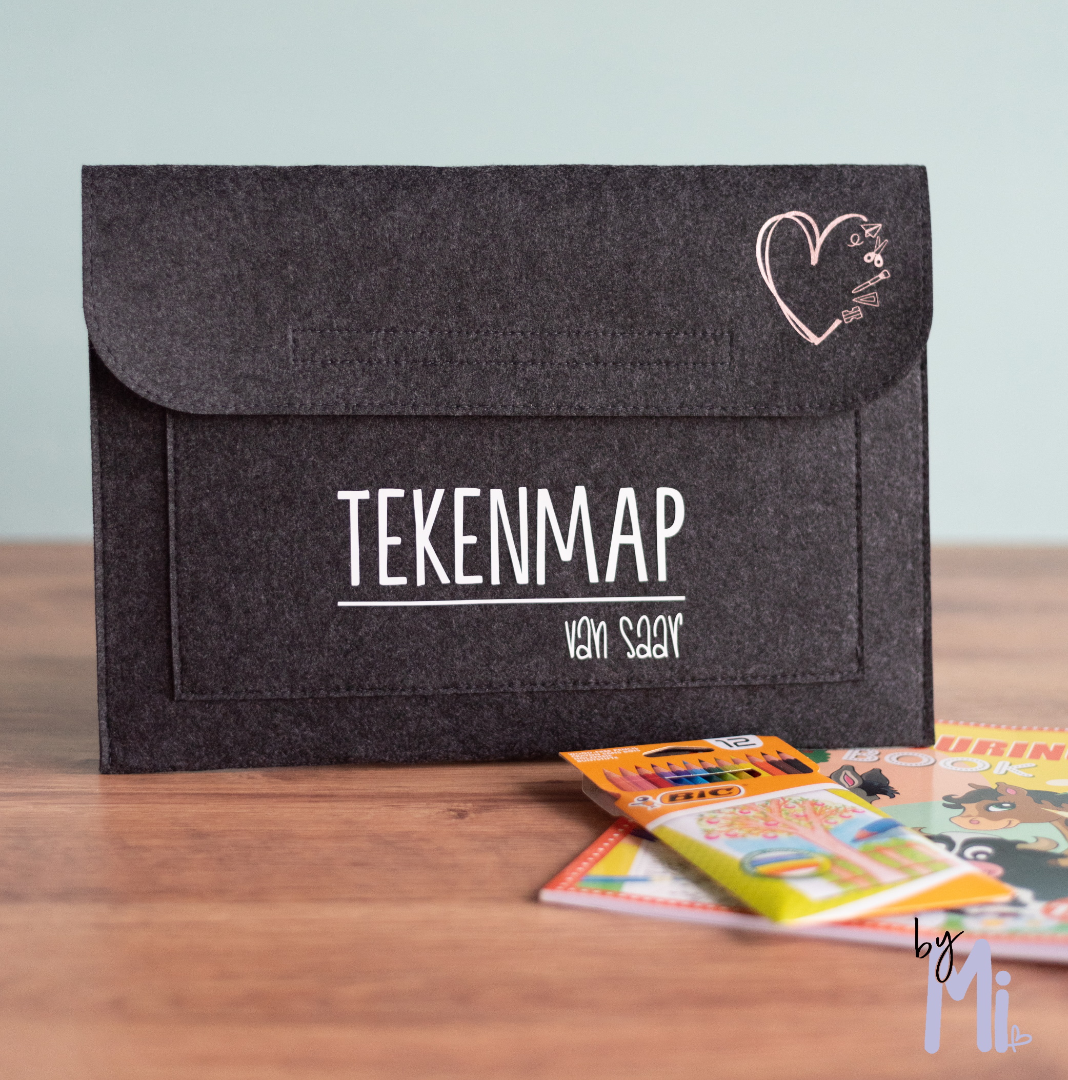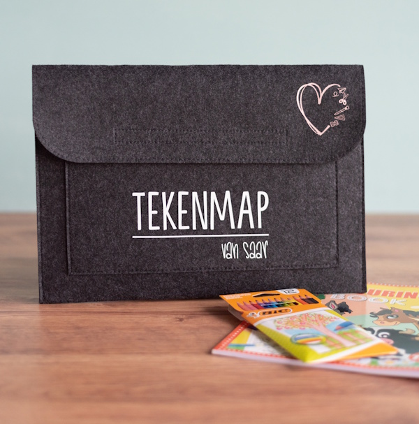 Maak kleuren en tekenen nog leuker met de Mijn tekenmap met naam hartje. Deze vilten map (37×26 cm, 2 mm dik) in antraciet wordt standaard geleverd met kleurpotloden en een kleurboekje. Jij kiest zelf welke naam er op de map gedrukt wordt, zodat je kind altijd een eigen en herkenbare map heeft.