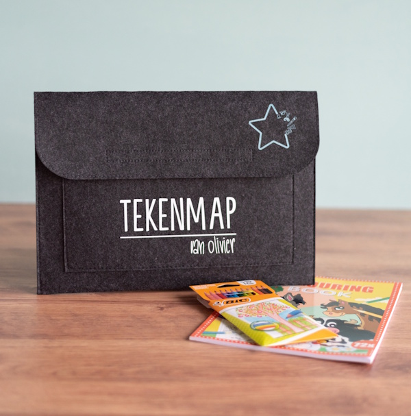 Maak tekenen extra bijzonder met de Mijn tekenmap met naam ster. Deze vilten tekenmap (37×26 cm, 2 mm dik) in antraciet wordt standaard geleverd met kleurpotloden en een kleurboekje. Je kiest zelf welke naam er op de map komt, zodat jouw kind altijd zijn of haar eigen map herkent.
