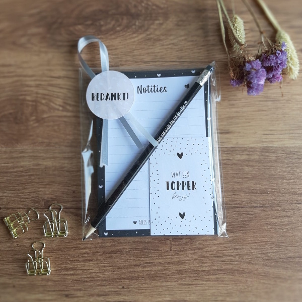 Het notitieboekje wordt geleverd met een bijpassend potlood, een kaartje voor jouw persoonlijke boodschap én een label met de tekst Bedankt. Mooi verpakt, direct klaar om te geven en geschikt voor talloze gelegenheden.