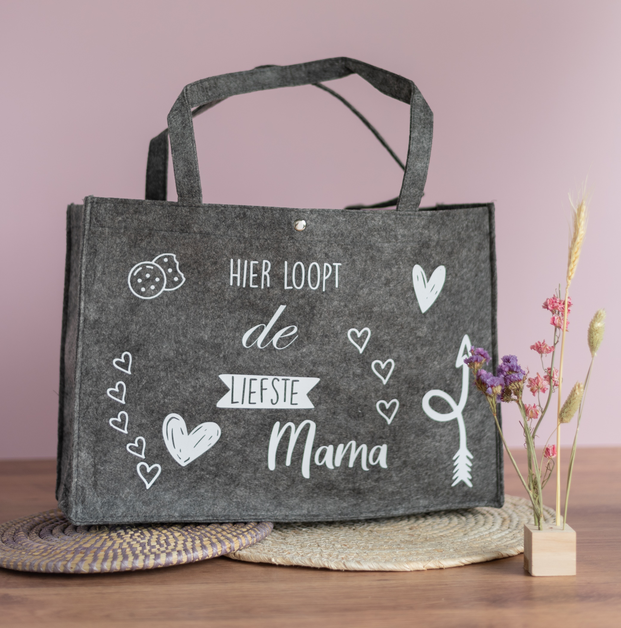 Op zoek naar een cadeau dat mama laat zien hoe bijzonder ze is? Deze vilten tas met de opdruk “Hier loopt de liefste mama” is precies wat je zoekt. Een cadeau dat haar niet alleen verrast met een persoonlijke boodschap, maar dat ze ook dagelijks kan gebruiken. Perfect voor Moederdag, haar verjaardag of gewoon zomaar.