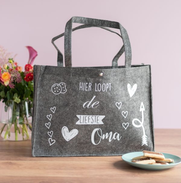 Ben je op zoek naar een bijzonder cadeau voor de allerliefste oma? Deze vilten tas met de opdruk “Hier loopt de liefste oma” is het perfecte geschenk om haar te laten zien hoeveel ze voor je betekent. Of het nu gaat om haar verjaardag, Moederdag of zomaar… met dit cadeau verras je haar op een persoonlijke én praktische manier.